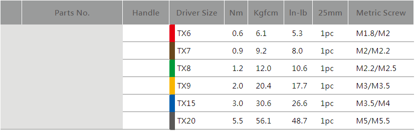 Специальная удобная универсальная рукоятка с 6 различными адаптерами (0,6 ~ 5,5 Нм) и 6 шт. 25-миллиметровых бит Torx®.